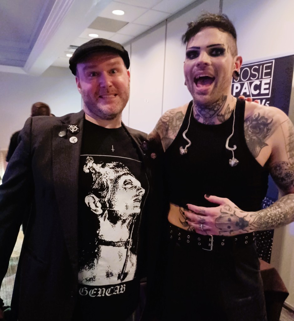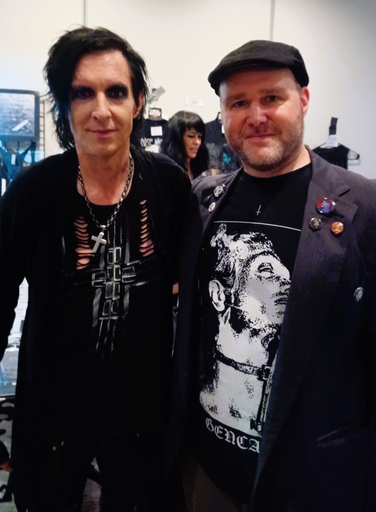 I wound up talking to Distortion Productions label head Jim Semonik, who was in the midst of his third Long Island Iced Tea and in a particularly jovial mood. Jim is also a musician (Red Lokust; Rein[Forced]) and a cancer survivor who spearheaded the successful Electronic Saviors compilations (I own the first two). I picked up some CDs, and he regaled me with tales of the Industrial-music biz and the struggles to get his bands booked on certain high-profile festival lineups (which shall remain nameless). I enjoyed talking with him – like me, he’s a very pleasant drunk, and I will always take that over the opposite. We spoke enthusiastically about Eva X, who will also be on tour with Moris Blak and Danny Blu this summer (triple-flame emoji!!!).
