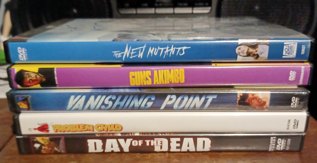 Vanishing Point was sealed (and a blind buy). The New Mutants is better than its reputation and production history would suggest. Problem Child is a classic from my childhood (even if the DVD is full-screen). I’m sure Steve Miner’s Day of the Dead remake is terrible, but it has Mena Suvari, Ving Rhames, and AnnaLynne McCord(!) in the cast, so I have to watch it at least once. And I remember hating Guns Akimbo for a myriad of reasons, but I find Samara Weaving a consistently interesting presence in movies I otherwise dislike (Mayhem; Ready or Not; Babylon; Scream VI…the list goes on), so maybe I’ll dig it on a second spin?