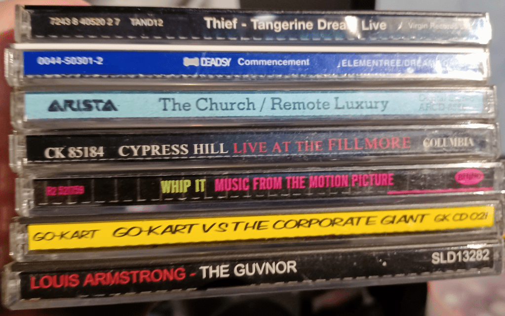 My partner stayed in the car, occupying herself with a book, while I combed through the shelves and bins of CDs (including a bunch of boxes located underneath the elevated vinyl racks). After scanning through their selection in as expedient and efficient a manner possible, I walked out with a nicely varied stack.